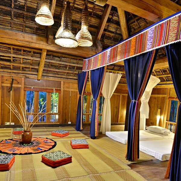 La retraite “ecolodge” de Pu Luong se trouve à flanc de colline. Elle jaillit d’une végétation tropicale et est entourée de rizières. C’est le lieu idéal pour découvrir ou profiter du Vietnam authentique et rural. Vous pouvez loger dans la maison sur pilotis (partagée avec d’autres occupants) ou bien bénéficier d’un bungalow privatif si vous souhaitez de la solitude.